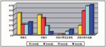 圖1 所示從1999年到2002年(2002年的數(shù)據(jù)是由上半年數(shù)據(jù)推算而來(lái))單探頭、雙探頭、雙探頭帶定位系統(tǒng)和多探頭符合線路,四種不同核醫(yī)學(xué)設(shè)備每年各種類型所占比例。可以看出。最為明顯的是普通雙探頭在2002年僅僅占總數(shù)的5%,普通單探頭占總數(shù)25%,多探頭帶符合電路系統(tǒng)占總數(shù)59%。普通雙探頭帶X線定位系統(tǒng)占總數(shù)10%。可以看出單探頭SPECT和多探頭符合電路系統(tǒng)呈增長(zhǎng)趨勢(shì),尤其以多探頭符合電路系統(tǒng)更為明顯。