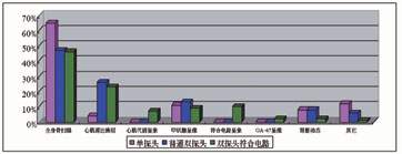 圖2 從2001年7月-2002年6月調(diào)研10家單探頭用戶、5家普通雙探頭用戶和30家雙探頭可變角度帶有符合電路用戶臨床檢查類型的數(shù)據(jù)。為了便于比較,采用相對(duì)數(shù)的方法。可以看出對(duì)于單探頭用戶在臨床主要用于骨掃描和甲狀腺檢查。對(duì)于雙探頭帶有符合電路系統(tǒng)的用戶,骨掃描46%、心肌血流灌注23%、符合電路10%、甲狀腺9%、心肌代謝7%、GA-67為2%,其它(腎臟、肝等)3%。可以看出雙探頭符合電路系統(tǒng)最大的貢獻(xiàn)是為臨床開(kāi)拓出20%新的檢查項(xiàng)目,最為重要的是這些檢查項(xiàng)目將成為主流臨床檢查。這可能是雙探頭(多探頭)符合電路在國(guó)內(nèi)急劇增加的主要原因。