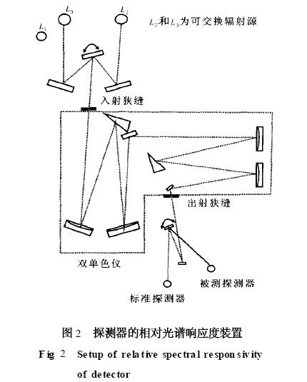 相對(duì)光譜響應(yīng)度測(cè)量用的傳遞標(biāo)準(zhǔn)是非選擇性的腔形熱電堆, 為了保持它的非選擇性, 熱電堆必須在窗口外操作。但由于沒(méi)有窗口, 探測(cè)器隨外界空氣波動(dòng)很靈敏, 它將產(chǎn)生一個(gè)毫瓦級(jí)的等效噪聲功率。為了準(zhǔn)確測(cè)量, 必須提供幾十毫瓦的輻射功率, 該輻射功率對(duì)雙單色儀來(lái)說(shuō)是不能接受的。如果使用單個(gè)單色儀, 則將會(huì)產(chǎn)生大量的雜散輻射, 但不會(huì)影響測(cè)量準(zhǔn)確度, 因?yàn)楸恍?zhǔn)的熱電堆與腔探測(cè)器一樣無(wú)選擇性。