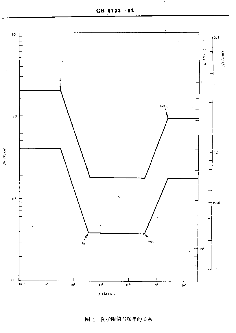 1.3 本規(guī)定中防護限值的適用頻率范圍為 100 k Hz~ 300 GHz。防護限值與頻率的關(guān)系見下圖。