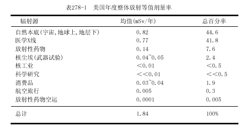 常用的測量單位是倫琴,戈瑞(Gy)和希沃特(Sv).倫琴(R)是空氣中x或γ電離輻射的計量單位,戈瑞是被各組織或物質(zhì)吸收的能量計量單位,它可應(yīng)用于各類輻射.R和厘戈瑞(cGy)基本上是相等的.在說明生物學(xué)效應(yīng)時,Sv與經(jīng)質(zhì)量因子校正的Gy相等.因為對一定量的能量而言,不同類型的輻射可產(chǎn)生不同的生物學(xué)效應(yīng);例如,中子有較大的效應(yīng).對X和γ輻射,Sv與Gy相等.在現(xiàn)代術(shù)語中Gy和Sv已替代拉德(rad)和雷姆(rem),Gy=100rad,Sv=100rem.在非專業(yè)刊物中常常將輻射分為低水平輻射(0.2~0.3Gy)和高水平輻射(>0.3Gy).而醫(yī)學(xué)劑量一般為<0.05Gy,而且常常<0.01Gy.地球及其大氣的本底放射活性水平很低,而不能測知其效應(yīng)(表278-1).