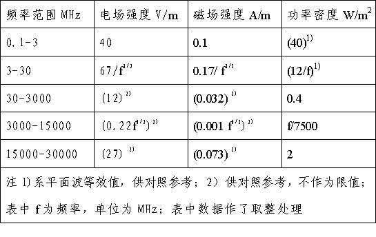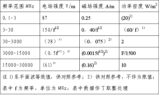 4、對(duì)于脈沖電磁波,除滿足上述要求外,其瞬時(shí)峰值不得超過(guò)表中1、2所列限值的1000倍。