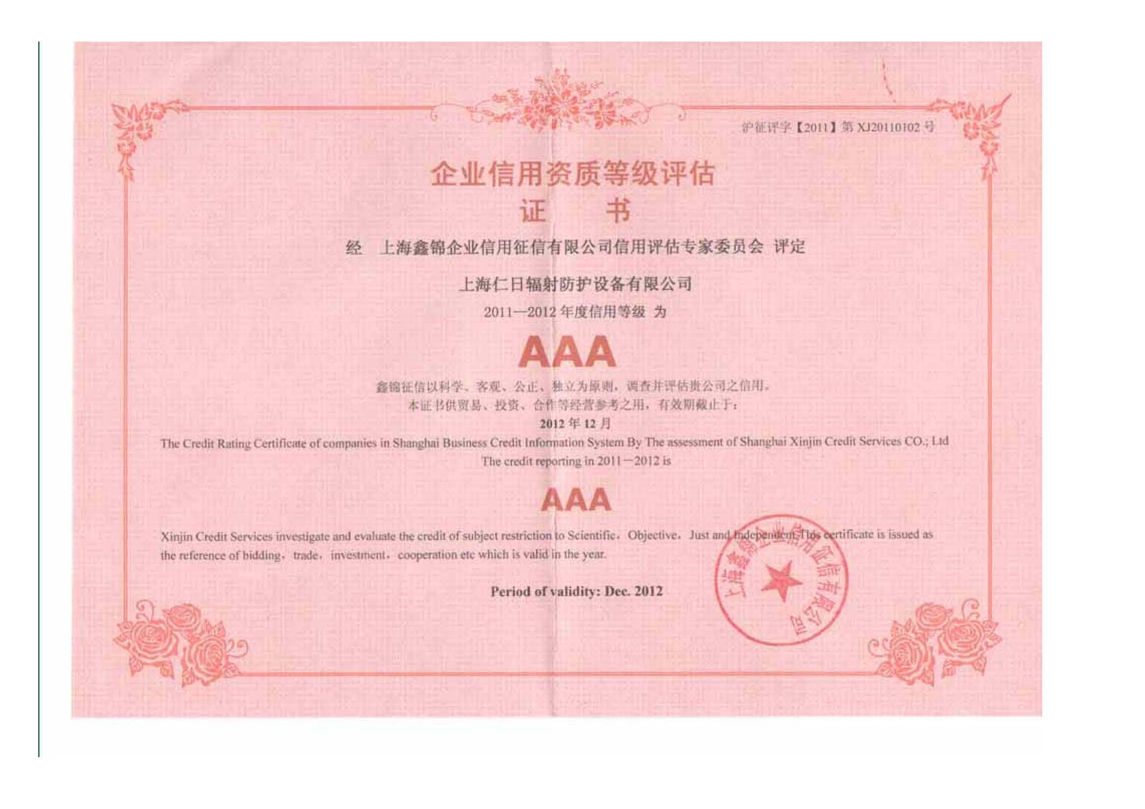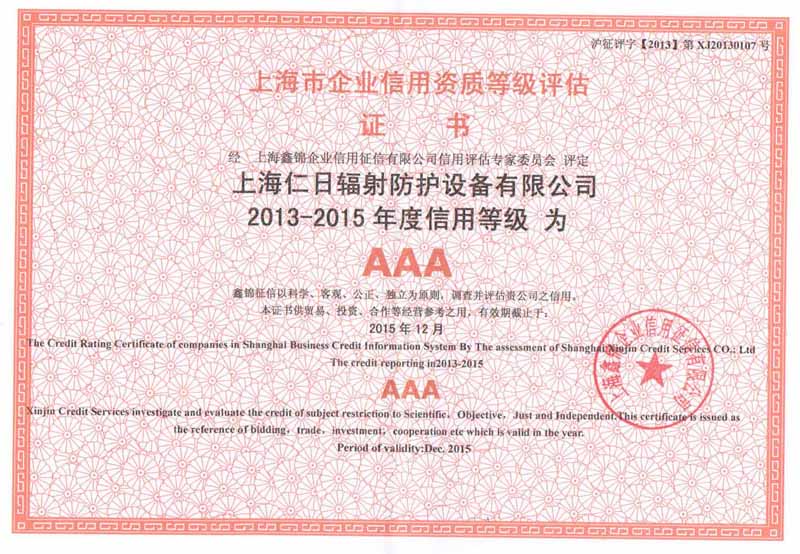 經(jīng)過(guò)公司全體同仁多年努力,以熱情服務(wù),誠(chéng)信待人,用戶滿意為服務(wù)目標(biāo),以"科技創(chuàng)新、精益求精,用戶滿意、持續(xù)改進(jìn)"為質(zhì)量方針. 2013年1月經(jīng)鑫錦企業(yè)信用征信有限公司信用評(píng)估專家委員會(huì)評(píng)定,上海仁日輻射防護(hù)設(shè)備有限公司被評(píng)為上海市AAA級(jí)企業(yè)信用單位。
